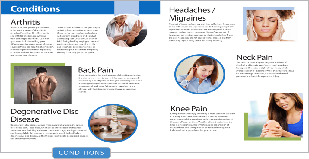 Educate your patients on common conditions that chiropractic care can help address, including headaches, neck pain, sciatica, arthritis, and more. Each section provides an overview of the condition, typical symptoms, and how chiropractic treatment can offer relief and improve quality of life. This valuable information helps patients understand the wide-reaching benefits of chiropractic care and empowers them to seek effective, natural solutions for their health concerns.